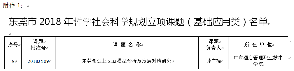 根据东莞市社会科学界联合会日前下发《东莞市2018年哲学社会科学规划课题立项(第一批)》(东社联通〔2018〕3号)通知。我院财经系薛广禄老师申报的“东莞制造业GEM模型分析及发展对策研究”获东莞市2018年哲学社会科学规划立项课题(基础应用类)(课题批准号:2018JY09)
